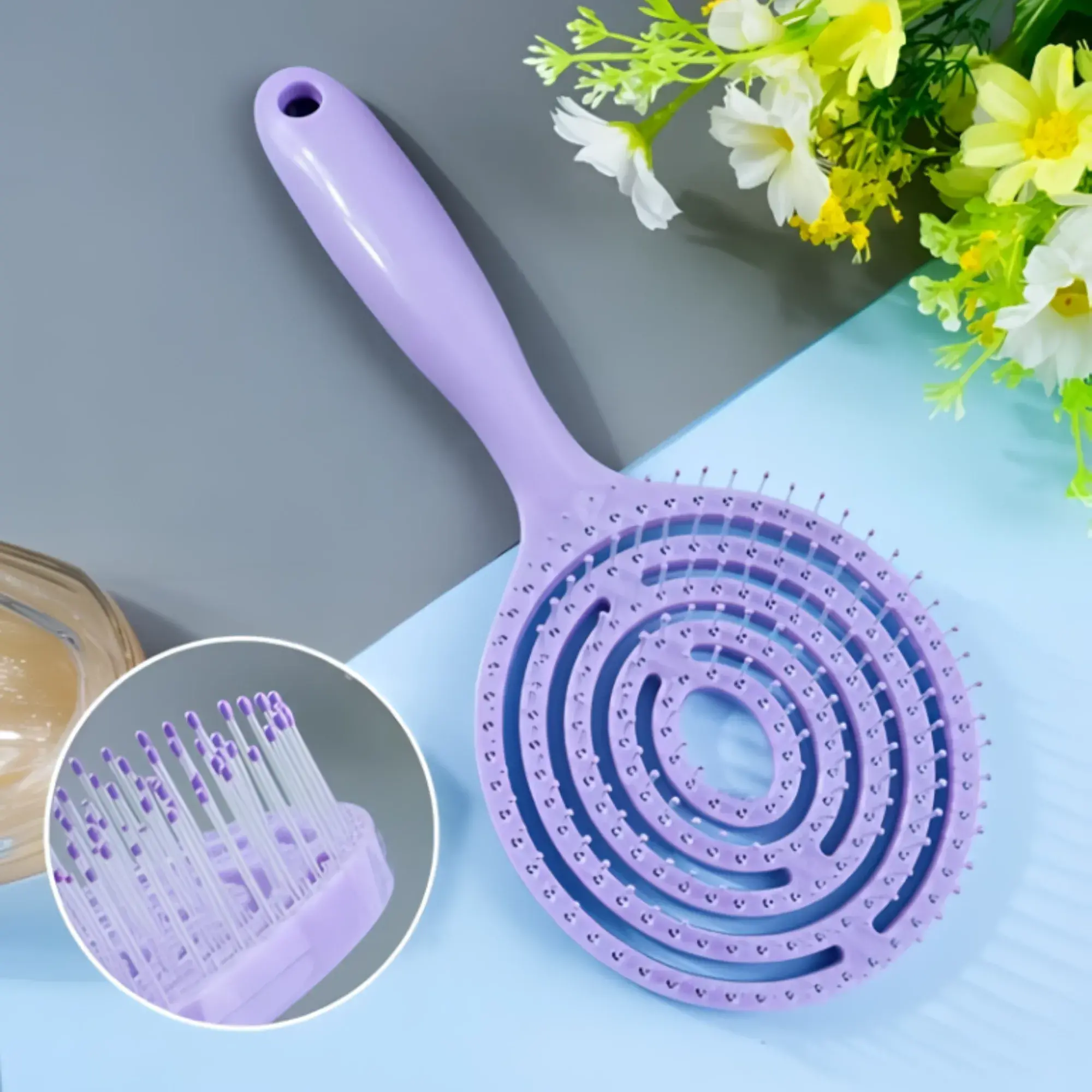 Nuestro cepillo desenredante flexible circular grande está diseñado para desenredar el cabello de forma rápida, suave y sin tirones, incluso en el cabello más rebelde. Gracias a su estructura circular flexible, se adapta perfectamente a la forma del cuero cabelludo, reduciendo la rotura y protegiendo la fibra capilar.